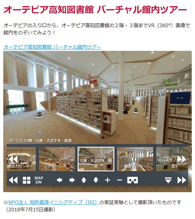 360°カメラを主に使用し、館内の様子や導線がわかるよなポイントを撮影し、公開したものです。PCのマウス、スマートフォンのタップ操作で館内の各ポイントを360°見渡すことができます。VRゴーグルをスマートフォンに装着すれば、より一体的に館内を見ることが可能です。